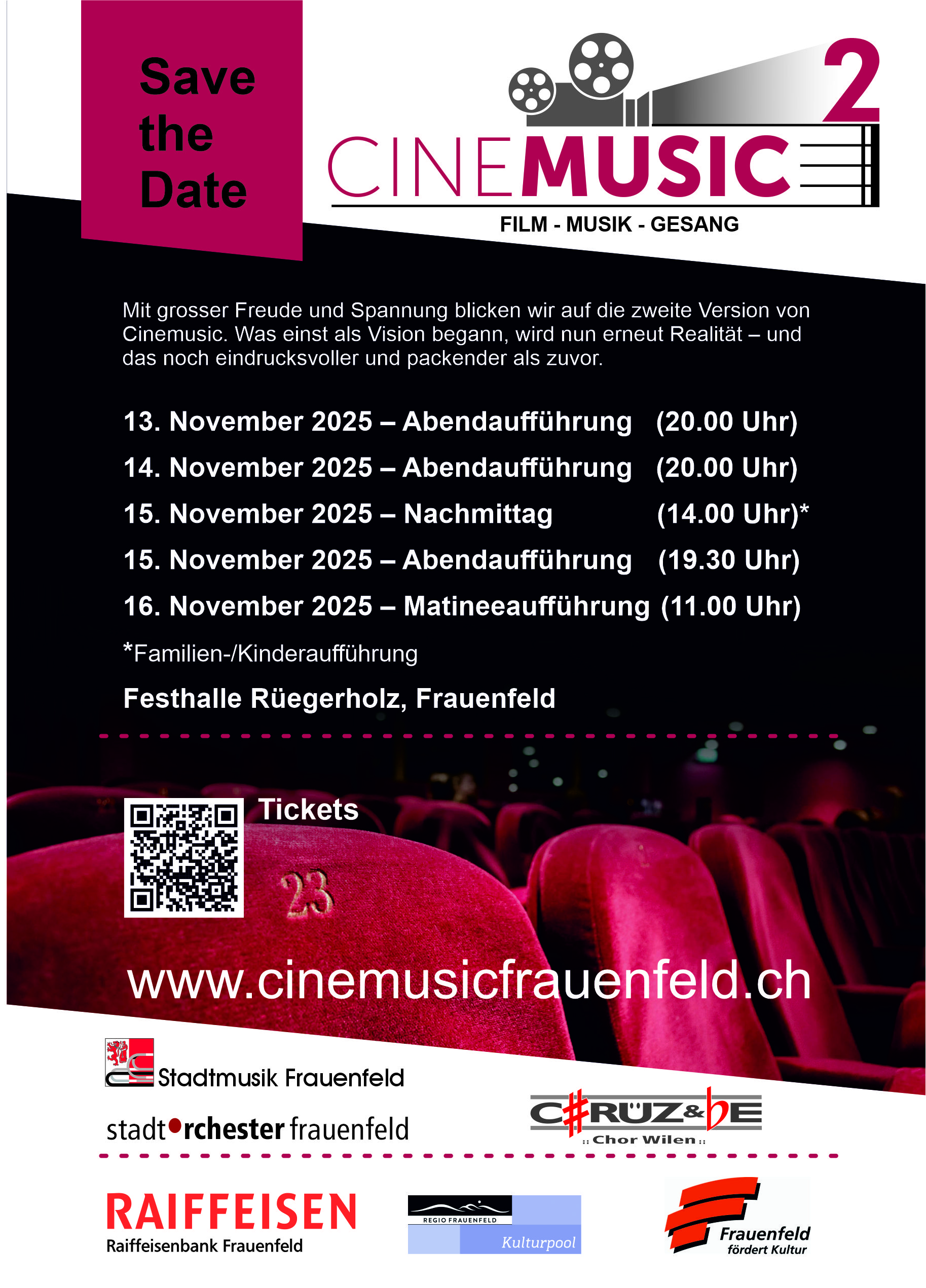 Im November 2025 erwartet euch ein aussergewöhnliches Konzerterlebnis in Frauenfeld: Cinemusic 2. Gemeinsam mit dem Stadtorchester Frauenfeld und dem Chrüz&Be Chor Wilen bringen wir – die Stadtmusik Frauenfeld – die grossen Momente der Filmmusik live auf die Bühne.